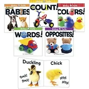 Baby talk board book set features easy-to-understand, age-appropriate text for a great way to introduce reading to your young learners. Playful illustrations provide a visually stimulating way to sharpen early learning skills. Your little ones will love learning new words, numbers, animal names and more. Titles include Opposites, Animal Babies, Colors, Shapes, First Words, and Let's Count.