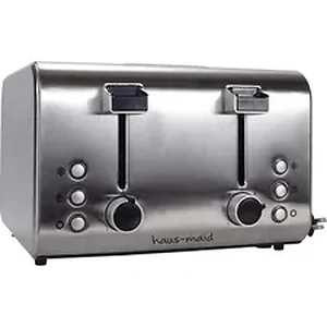 Four-slice toaster toasts, reheats and defrosts with a self-centering function for optimum results. Multiple settings accommodate a wide variety of tastes. Stainless steel casing offers a professional look. Haus-Maid 4-Slice Toaster also includes a removable crumb tray for easy cleaning and cord storage for its two-prong, 3' cord.