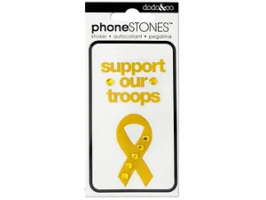 Enhance your phone with these stunning jeweled Support Our Troops Phone Stickers. Each package includes a sheet containing two beautifully designed stickers. They come neatly packaged in a poly bag featuring a colorful header card, making them a perfect gift or personal accessory.