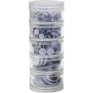 Assorted wiggle eyes come in a stackable five-tier storage jar. Jar contains 560 pieces of black/white wiggle eyes in assorted sizes to decorate craft projects. Sizes include twenty 20mm oval black eyes, 288 5mm round eyes, 144 7mm round eyes, 72 10mm round eyes and 36 15mm round eyes.