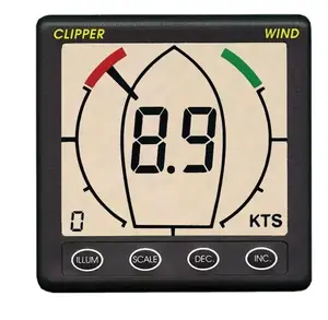 The Clipper Wind system shares the same 110mm square case as its sister instruments in the Clipper range. the display is exceptionally large and clear, with 60 segments for full 360 degree direction indication. Windspeed is shown in knots, M.P.H. or Metres/second. The pointer style is selectable, from the single segment shown above, to multi segments for greater clarity or a 'windex' style indicator. The Masthead unit is well proven and supplied with 20 metres of cable as standard.