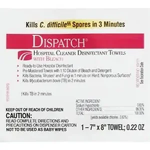 Dispatch Hospital Cleaner Disinfectant Towels with bleach are intermediate-level, hospital disinfectant wipes that meet CDC, CMS and OSHA guidelines for cleaning and disinfecting surfaces in healthcare facilities. Ready-to-use, one-step wipes contain a 1:10 bleach dilution. Premoistened towels are EPA-registered to kill C. difficile spores in 3 minutes and other common healthcare pathogens just 1 minute. These wipes kill 99.9999 percent of C. difficile spores, according to the current EPA-recommended testing standard (June 2014). They are designed for clinical usage for disinfecting equipment and high-touch surfaces. Wipes contain an anticorrosion agent and are formulated for broad surface compatibility with healthcare surfaces, including stainless steel, glass, plastic, porcelain, glazed ceramic, laminated surfaces and vinyl. Light fragrance provides a comforting scent for your patient and staff. Disinfectant towels are intended for use in healthcare settings.