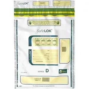 Providing a perfect balance of security and ease of use, SafeLOK Tamper-Evident Deposit Bags are ideal for retail applications where quick training of new employees is important. Patented security features alert to attempted theft while Press2Lok technology makes using the bag easy for your associates. Press2Lok closure is simple press to seal. High-visibility void message alerts you to tampering with cold or chemicals. Special thermochromic ink on the high-performance film turns red when subjected to heat. Random, printed line graphics prevent cut-and-replace tampering. Anti-static liner does not cling to hands and clothes, speeding up processing. Large serial numbers and bar codes allow easy tracking via CCTV. Security border and micro printing prevent cutting and resealing. Each bag includes a serial number and tear-off receipt.