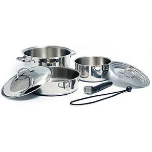 The Compact Stainless Steel 7-Piece Nesting Cookware Set is designed for efficiency in RVs, boats, and small kitchens. This nesting cookware minimizes storage needs, fitting easily into less than a cubic foot of space.