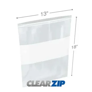Discover the convenience of our Reclosable White Block Clearzip Lock Top Bags, sized at 13" x 18" and made from durable 2 mil low density polyethylene. These bags feature a white block area specifically designed for easy labeling and organization, making them ideal for various applications.