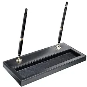 Double Pen Stand features decorative stitching to deliver a classy look. Top-grain leather adds professional style to any work space. Storage compartment offers convenient storage space for small supplies. The bottom is lined with soft velveteen to protect surfaces from scuffs and scratches. Pen stand includes black rolling ball pens with gold accents. Pens accept Pentel Excalibur, Itoya and Mont Blanc 163 rolling ball pen refills.
