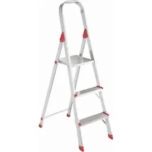 Safely complete overhead tasks with this lightweight, aluminum platform ladder. Large, locking, slip-resistant platform provides a comfortable and secure working area. Heavy-duty gusset bracking and a top rail guard feature a durable design for increased stability. Aluminum tubing and European design can be easily stored. Nonmarring, rubber foot caps protect your surfaces and are slip-resistant. Deeply serrated steps offer a reliable grip during use. Ladder meets OSHA and ANSI duty rating for 200 lb.