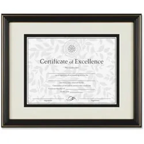 Gold-trimmed document frame features a sophisticated design that seamlessly combines with the style of any traditional room. Bold border around the certificate elegantly attracts attention to the center. Frame hangs either vertically or horizontally on the wall. Included certificate of excellence is ready to use.