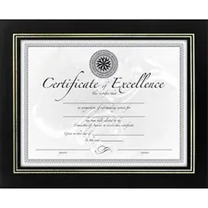 Leatherette frame offers the rich look of leather trimmed with double gold accent lines for prestigious accent. Flat design features a plastic face to protect your award certificates. Die-cut easel back and hangers allow vertical or horizontal placement on desks or walls. Frame also includes a usable certificate.