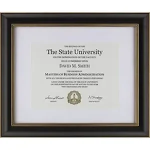 Document frame features a wood border with gold accents to elegantly showcase your memorable achievement. Versatile construction allows either vertical or horizontal wall display for multiple viewing options. Document frame with included certificate is perfect for displaying a certificate, award and more.