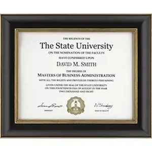 Document frame features a wood border with gold accents to elegantly showcase your memorable achievement. Versatile construction allows either vertical or horizontal wall display for multiple viewing options. Document frame with included certificate is perfect for displaying a certificate, award and more.