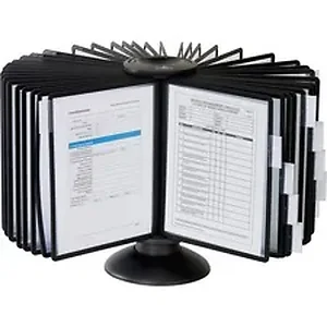 Sherpa Carousel 40 offers a revolving reference system that showcases 80 letter-size sheets in 40 movable panels. Ideal for displaying information for quick perusal. Panels have rugged black borders and revolve easily on pipe stand. Base is weighted for stability. Rubber pads on base prevent slipping and scratching the surface. Carry handle turns the reference system and lies flat when not in use.