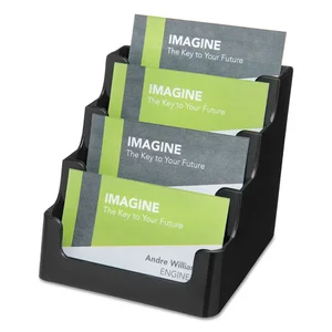 Make four times the impression with this four-tier desktop business card holder. Card holder separates and provides clear view and easy access to multiple cards in eight sections. Generous capacity holds up to 50 cards per tier. Plastic business card holder contains recycled material.