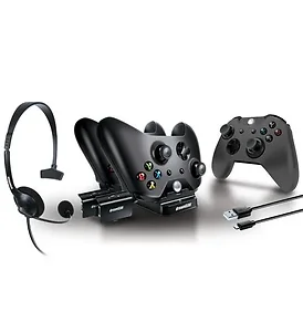 - Wired headset- Features inline volume and mute controls- Approximately 4 foot cable- Connects directly to your Xbox One® controller- Dual Power Dock- Controllers slide in/out easily- LED charge indicators- USB powered- 2 Battery packs- Fit directly into the Xbox One® controller- Up to 6 hours of playtime- 10 Foot Micro-USB charge cable included- Protective cover and Joystick caps- Precision cutouts for each button, joystick and the D-Pad- Non-slip material with ribbed grip- Soft-touch silicone material- Protect your controllers from dust and scratches- Charge cable- 10 Foot charge cable- Play wired with and without the use of batteries- Reinforced Micro-USB connectors ensure a solid connection