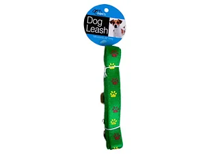 Great for dogs of all sizes, this Woven Dog leash features a fun paw print design, metal spring clip latch and wrist strap. Comes in assorted colors that may include blue, green, and red. Measures approximately 4' long. Comes packaged with ties and a UPC tag.