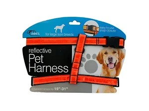 Walk your dog safely and securely with this easily visible Large Reflective Harness featuring a durable, adjustable harness with an orange reflective covering and an easy to use snap closure. Fits necks 19"-31" in diameter. Comes packaged to a hanging panel.