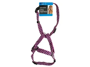 The harness includes a reliable plastic squeeze buckle and a strong metal collar connector ring, ensuring your pet is safe while looking fashionable. Available in various designs: pink with purple stripes, pink and black checkered patterns, and pink with lime green dots. Each harness comes neatly packaged with a hang tag for easy display.
