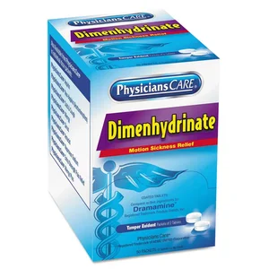 Dimenhydrinate tablets are an effective solution for preventing and treating motion sickness. Each tablet is easy to swallow and comes in a convenient two-tablet pack. This product is available in a box of 50 packs, making it perfect for travel or home use.