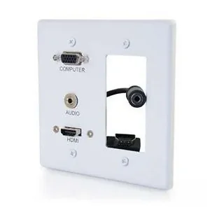 The Dual Gang HDMI, VGA, and Audio Wall Plate in White offers a sleek, modern solution for integrating your audio-visual setup. This in-wall mountable plate provides seamless connections for HDMI, VGA, and 3.5mm audio, allowing you to keep your cables organized and out of sight.
