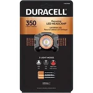 Focusing Beam LED Headlamp is made for adventure. Three modes include high focusing, low-beam focusing and red night vision. With 350 lumens of light, the headlamp will shine up to 2 hours with a beam distance of 60 meters. It is resistant to water splashes from any direction with a waterproof rating of IXP4 and can survive a drop over 1 meter. Powered by three AAA batteries (included), this headlamp with comfort strap offers the right amount of light exactly where you need it.