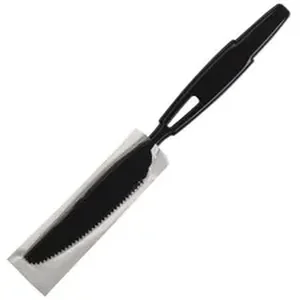 Ultra SmartStock Series-W Heavyweight Knife Refill is designed for use in Dixie Ultra SmartStock Series-W Wrapped Cutlery Dispensers (SSW3D85, SSW1D85). Each full-length polypropylene knife is individually wrapped at the critical end to promote hygiene. Elegant, black design helps you promote an upscale image. Break-resistant knives offer excellent value without sacrificing performance. They come on preloaded skewers that hold 40 pieces of cutlery to save load time compared to wrapped cutlery bins. They are ideal for takeout and delivery orders.
