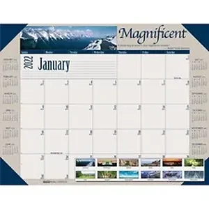 Desk pad features an inspirational quote and a corresponding photo each month. Monthly, dated planning pages range 12 months from January to December. One-page-per-month format includes unruled daily blocks (2-1/2" x 2-1/2"), ruled notes section, count of days/days remaining, numbered weeks, and full-year reference calendar along the sides of each month. Desk pad features four leatherette corners. Paper is made with a high percentage of recycled fiber. Desk pad is nonrefillable.