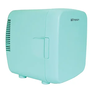 • AC power rating: 52 watts; 12-volt DC power rating: 3.4 amps/40 watts;• Stores up to twelve 12-oz. cans or 9.5 qts. (9 L) in a compact space;• Ideal for storing snacks, beverages, skincare products, and more;• Space-saving design will fit virtually anywhere such as on your desk, vanity, RV, or countertop;• Uses super-quiet thermoelectric technology which is also vibration-free and does not use harmful CFCs or HFCs;• Cools to 28deg F to 30deg F below ambient temperature of room;• Locking latch mechanism keeps door firmly closed;• Operates on AC power and can also run on your car's 12-volt battery;• Dimensions: 11.9 in. L x 12.3 in. W x 11.7 in. H;• Includes removable shelf, AC power cord, 12-volt DC car adapter, user manual, and warranty card;• Turquoise;