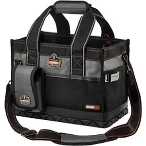 Arsenal 5810 Open Top Tool Organizer is sized for easy toting. Open top makes it easy to get tools in and out of the nine interior pockets. Tool bag also offers 21 exterior pocket, an outside tape loop, detachable phone holder, parts organizer and junk pouch for more convenience. Molded rubber base keeps tools dry and clean. Tool organizer is made with 1680D ballistic polyester and nickel-plated hardware. Use the padded shoulder strap or handle on the top to easily carry to your next job.