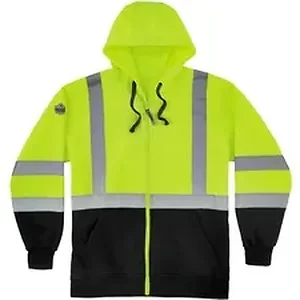 GloWear 8372 Class 3 Zip-Up Hi-Vis Hooded Sweatshirt with black front meets ANSI/ISEA 107-2015 Type R, Class 3 Standards for safety. It is designed with high-quality, 100 percent polyester lined with polar fleece to provide high visibility and warmth during chilly days. This safety sweatshirt has two slash-style pockets great for additional hand warmth and storage. Bottom front and wrist sections of the sweatshirt are black to prevent a dirty look where it matters most. Contrasting, high-visibility, yellow/lime color provides ultimate visibility. The 2" ANSI-compliant, silver reflective tape on the torso, shoulders and sleeves make it a great reflective hoodie to wear as night falls for effective visibility. Zipper front closure, drawstring hood and elastic knit waistband and cuffs keep the heat in for all-day warmth throughout the workday. Safety sweatshirt is perfect for jobsites in high-traffic areas like road construction or anywhere that requires high-visibility clothing.