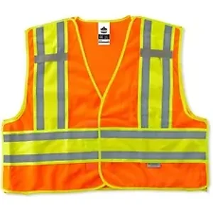 Made of ANSI-compliant, polyester solid (3.6 oz) with a mesh back (3.3 oz), the 8245PSV Public Safety Vest is Type P, Class 2-approved for worker safety in low-light conditions. ANSI-compliant 3M Scotchlite reflective tape and fluorescent color provide maximum visibility and protection. Contrasting, fluorescent, 4-1/2" sections cross vertically and horizontally with reflective tape to further enhance visibility. Hook-and-loop breakaways on shoulders and side easily disentangle vest from dangerous situations. Store and quickly access equipment in divided inside pocket for organization. Safety vest securely holds two radios with the stable mic tabs.