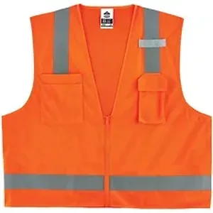 8249Z Hi-Vis Surveyors Vest is an ANSI 107 Type R, Class 2 economy vest with a polyester solid front (3.6 oz) and breathable, polyester mesh back (3.3 oz). This vest features 2" reflective tape for enhanced, low-light visibility. With two interior and two exterior pockets, this vest provides ample storage for pens, notebooks, tablets and more. Store your phone in the vest's handy, designated phone pocket. A single mic tab allows convenient radio access. Zipper closure provides quick on/off movements. Vest comes in dual sizing to accommodate different fits and bulky clothing. This reflective safety vest is ideal for anyone requiring Type R, Class 2 apparel, including road construction, baggage handling and municipalities.