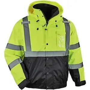 Made with a fleece body (280 g) and quilted sleeves, wear this 8381 Hi-Vis 4-in-1 Thermal Bomber Jacket in multiple ways for ultimate adaptability in extreme cold. Zip out the liner to wear it as a fleece jacket. Zip off liner sleeves to wear as a vest. Wear the shell on its own as a weatherproof layer or leave the liner zipped into wear as a winter jacket. It is Type R, Class 3-approved for workers in high-traffic areas needing extra visibility. The 2" 3M Scotchlite reflective tape on chest and arms heightens visibility in low-light environments. Look clean with black panels on front and arms that hide dirt. Easily take on or off with zipper closure that doesn't snag. Detach the drawstring hood to minimize bulk. Store gear in the zipper chest pocket for safe-keeping. Combination chest pocket holds a phone and ID badge. Hook radios to the secure mic tabs. Jacket is perfect for construction or transportation workers or even while hiking and snowmobiling.
