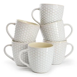 The Elama Honeycomb Mug Set features six beautifully designed 15-ounce mugs, perfect for enjoying your favorite hot beverages. With a unique honeycomb debossed pattern and a sleek glossy finish, these stoneware mugs blend nature-inspired charm with modern style. Ideal for coffee, tea, or any hot drink, this set adds a touch of elegance to your kitchen.