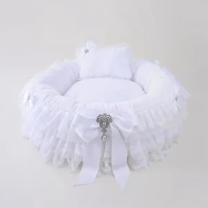 The Elegant Anastasia Lace Dog Bed by Hello Doggie is the epitome of luxury for your cherished pet. This stunning bed features romantic lace trim and is artistically adorned with white satin bows, each embellished with eye-catching rhinestones.