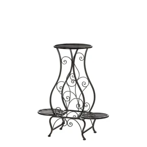 Add a touch of elegance to your indoor or outdoor space with this stunning hourglass iron plant stand. Perfect for showcasing your favorite plants, this stand combines beauty and functionality. It features three slatted platforms, designed to hold various pot sizes, while the intricate curling iron embellishments enhance its charm.