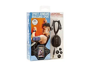Go the distance and get pumped when listening to your workout playlist with the help of Retrak Blue Armband and Retractable Sports Wrap Earbuds. The reflective accent armband keeps your device dry with its moisture-proof pocket. The lightweight, breathable fabric provides comfort for your physical activity. The band fits most smartphones of 2.50" width x 5.25" height. It comes packaged in a clear 7" x 5.25" x 1.75" hanging box.