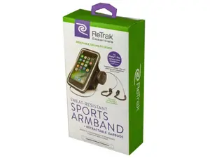 Go the distance and get pumped when listening to your workout playlist with the help of Retrak Sweat-Resistant Sports Armband with Retractable Earbuds. The reflective accent armband keeps your device dry with its moisture-proof pocket. The lightweight, breathable fabric provides comfort for your physical activity. The band fits most smartphones of 2.50" width x 5.25" height. It comes packaged in a 7" x 4" x 1.75" hanging box.