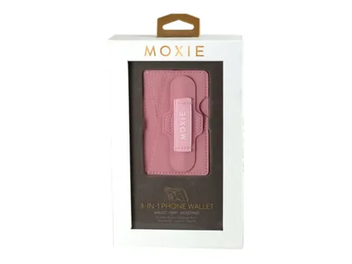 The Moxie 3-in-1 wallet in pink is designed for versatility. It adheres to the back of your phone to provide a secure grip, store cards, and enable heads-free use. The adhesive wallet is approximately 3.75" x 2.25" in size. Press down to activate grip and kickstand. It comes packaged in a 7.25" x 4.50" x 1.25" hanging box.