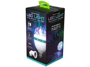 I gotta feeling that tonight's gonna be a good night with this Rotating Party Light Blub. Turn any room into a party with it's rotating LED Light fun party colors. Simply plug to a socket or outlet and turn it on. The rotating party light bulb is approximately 6.50" x 3" diameter. It comes packaged in a 6.15" x 3.25" x 3.20" hanging box.