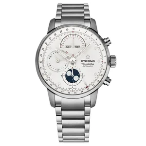 Eterna Men's 2949.41.66.0279 'Tangaroa' White Dial Moonphase Chronograph Automatic Watch The Eterna Men's 2949.41.66.0279 'Tangaroa' White Dial Moonphase Chronograph Automatic Watch features a stainless steel 42mm case, with a fixed bezel, a white dial and a sapphire crystal . The stainless steel band is fitted with a deployment clasp. This beautiful wristwatch is powered by automatic movement. This watch has a water resistance of up to 50 meters, not suitable for long periods of recreational swimming and also diving or snorkeling. Features: Brand: Eterna Model number: 2949.41.66.0279 Dial Shape: Round Dial window material type: Sapphire Display Type: Analog Case material: Stainless Steel Clasp: Deployment Case diameter: 42 millimeters Case Thickness: 14 millimeters Band Material: Stainless Steel Band length: 8 inches Band width: 20 millimeters Band Color: Silver tone Dial color: White Bezel material: Stainless Steel Bezel function: Fixed Special features: Chronograph Movement: Automatic Water resistant depth: 50 meters/165 feet Calendar: Perpetual Calendar, central date hand, day and month at 12 o'clock, moon phase UPC: Eterna 2949.41.66.0279 MSRP: $6,750