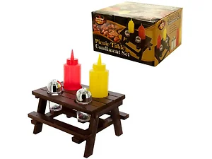 The set includes a ketchup dispenser and a mustard dispenser, along with salt and pepper shakers, all beautifully arranged on a miniature wood picnic table. Perfect for barbecues, picnics, or backyard gatherings!
