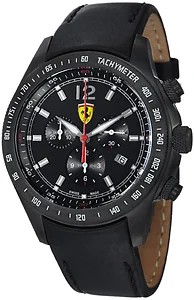 Ferrari Men's FE07IPBCPBK 'Scuderia' Black Dial Chronograph Quartz Watch The Ferrari Men's FE07IPBCPBK 'Scuderia' Black Dial Chronograph Quartz Watch features a stainless steel 44mm case, with a tachymeter bezel, a black dial and mineral crystal . The calfskin band is fitted with a deployment buckle clasp. This beautiful wristwatch is powered by swiss quartz movement. This watch has a water resistance of up to 50 meters, not suitable for long periods of recreational swimming and also diving or snorkeling. Features: Brand: Ferrari Model number: FE07IPBCPBK Dial Shape: Round Dial window material type: Mineral Display Type: Analog Case material: Stainless Steel Clasp: Deployment Buckle Case diameter: 44 millimeters Case Thickness: 12 millimeters Band Material: Calfskin Band length: 8 inches Band width: 21 millimeters Band Color: Black Dial color: Black Bezel material: Stainless Steel Bezel function: Tachymeter Special features: Chronograph Movement: Swiss Quartz Water resistant depth: 50 meters/165 feet Calendar: Date UPC: 794504012743 Ferrari FE07IPBCPBK MSRP: $995