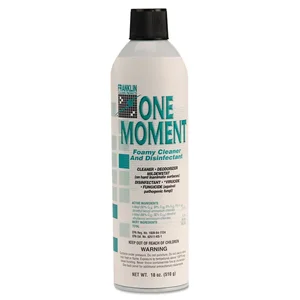 Experience the power of a fast-acting cleaner with our One Moment Foamy Cleaner and Disinfectant. Designed for effective use on a variety of surfaces, this citrus-scented aerosol cleaner leaves behind a fresh, invigorating scent while eliminating germs and bacteria.
