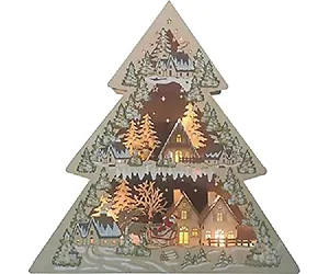 Bring holiday cheer to your home with this charming wooden Christmas tree crafted from high-quality plywood. This festive decor piece features beautifully painted Christmas trees that border two enchanting scenes of snow-covered houses at night. Each house is intricately detailed and illuminated with warm white LED lights that create a cozy glow.