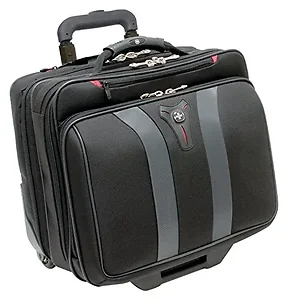 Carry your belongings in comfortable style with this SwissGear Granada Wheeled Case for 17" Laptops. A modern interpretation of the classic wheeled business case, it is neat, organized and doesn't weighing you down. It features three separate zipper compartments, including a front organizer for your pens, phone, iPod, business cards, ID and other small accessories. This black laptop wheeled case also features a laptop sleeve and an expandable file to help keep your work neatly contained. The large overnight storage area gives you plenty of space for a complete ensemble for the next day's business meeting. This SwissGear Granada Wheeled Case for 17" Laptops comes with easy-glide skate wheels that allow for smooth maneuvering through high-traffic and narrow walks. It also has a locking telescoping handle for comfort and a trolley strap.SwissGear Granada Wheeled Case for 17" Laptops: