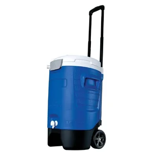 The Igloo 5-Gallon Roller Cooler in blue is designed for ultimate convenience and functionality. Perfect for outdoor events, picnics, or jobsite hydration, this cooler ensures your drinks stay cold on the go.