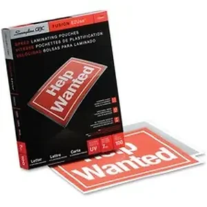 Easy-to-use laminating pouches quickly provide outstanding lamination accuracy. EZUse alignment guides magically disappear after lamination to simplify the lamination process. Alignment guides make centering documents easy. Directional arrows indicate which edge of the pouch should be loaded into the laminator first to prevent confusion. Ultraviolet protection preserves color integrity and prevents yellowing up to 10 times longer than standard pouches. Letter-size speed pouch is sealed on the long side to enable it to quickly run through the laminating machine for time-saving performance.