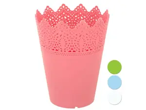 Made from durable plastic, it features a beautiful lacy cutout top border with a zigzag edge, making it a delightful addition to any space. The pot measures approximately 5.5 inches tall with a 4-inch top diameter and a 2.75-inch base diameter, adding the perfect touch to your decor.