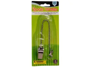This premium metal sports whistle, complete with a sturdy chain, is designed for referees and coaches during games and practices. Its high-quality construction ensures durability while the integrated plastic ball produces a sharp and clear sound. Measuring approximately 12.25 inches in total length, it is easy to carry and always within reach. Each whistle comes packaged in a blister pack for convenience.