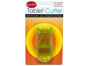 Made of durable plastic with a sharp metal cutting edge, it ensures precise cuts every time. Available in assorted colors, this tablet cutter measures approximately 3 1/2" x 1 1/2" and comes packaged on a blister card for convenience.